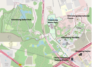 Das Chimelong Resort liegt im Bezirk Panyu, etwas südlich des Stadtzentrums von Guangzhou. Trotz der Größe ist es hervorragend angebunden: