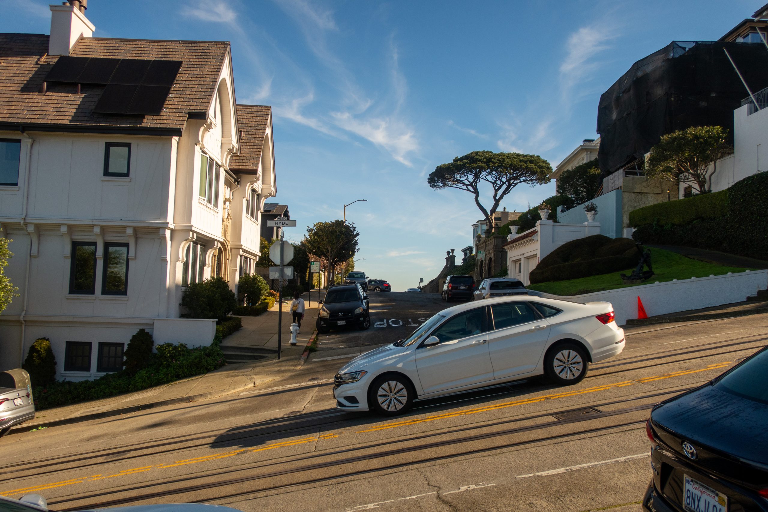 We walked past Fisherman’s Wharf, which felt pleasantly sleepy in the early morning. If you are looking for hustle and bustle and open shops, you should come in the afternoon; for us, however, the morning quiet was ideal for moving quickly toward the famous Lombard Street. The climb up the steep streets is exhausting but rewards you along the way with classic San Francisco photo stops: steep roads and Victorian townhouses. Once at Lombard Street, it’s fun to spend some time watching the stressed drivers zigzagging through the famous serpentines between flower beds. If you like, you can hop onto the historic cable car at the top of Lombard Street or, like us, watch the tram pass by from the outside.